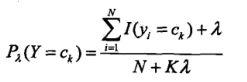 我们可以看到是在贝叶斯方法的条件概率的分子分母上都加上了常数项,其中λ>=0,当λ时0的时候,就回归成了我们前面说的极大似然估计了。取λ=1,成为拉普拉斯平滑(拉普拉斯修正)。