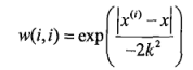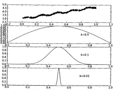 w需要是一个只含对角元素的权重矩阵w,并且点x和x(i)越近,w(i,i)将会越大。上述公式中,有个常数项k,这个k决定了对附近的点赋予多大的权重,参考下图: