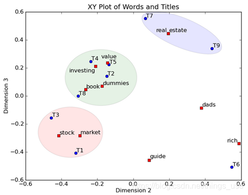在图上,每一个红色的点,都表示一个词,每一个蓝色的点,都表示一篇文档,这样我们可以对这些词和文档进行聚类,比如说stock 和 market可以放在一类,因为他们老是出现在一起,real和estate可以放在一类,dads,guide这种词就看起来有点孤立了,我们就不对他们进行合并了。按这样聚类出现的效果,可以提取文档集合中的近义词,这样当用户检索文档的时候,是用语义级别(近义词集合)去检索了,而不是之前的词的级别。这样一减少我们的检索、存储量,因为这样压缩的文档集合和PCA是异曲同工的,二可以提高我们的用户体验,用户输入一个词,我们可以在这个词的近义词的集合中去找,这是传统的索引无法做到的。