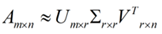 我们将式1矩阵分解中的右侧部分的n变成了r,这就是降维了,降维的过程和特征值特征向量的降维类似,我们这里取的是奇异值的前r个,然后可能包含了大部分的信息,所以就只保留了前r个特征来表示矩阵A,近似等于原矩阵。由于分解后的三个矩阵维度相对较小,所以我们就可以用保存更小的三个矩阵(U,Σ,V)近似替代原矩阵即可。如图1所示: