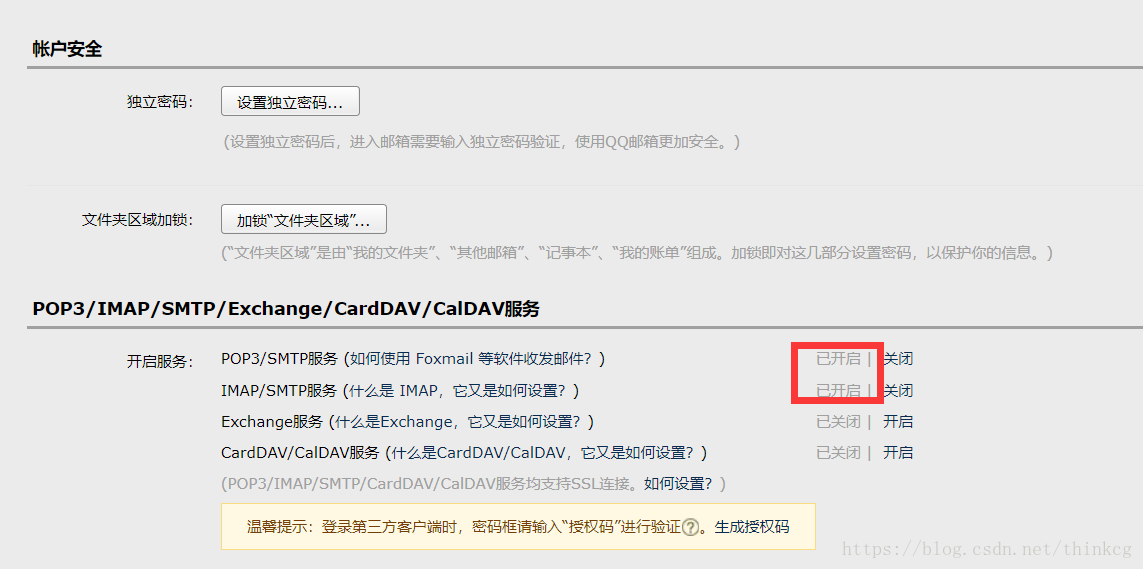 要注意的是,qq邮箱中设置——帐户里面,两个有关smtp服务开启。