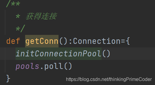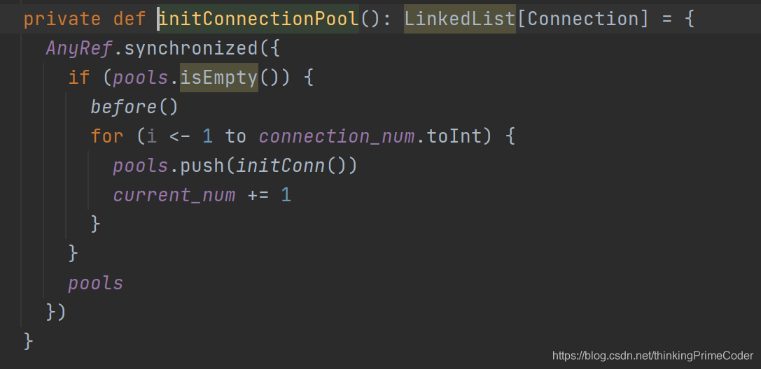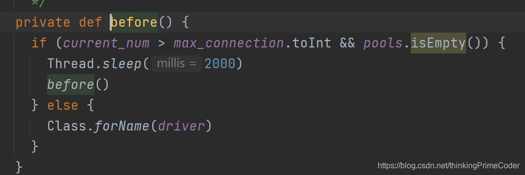 6.查看初始化连接池的代码发现在线程池连接已经用完并且连接数已经达到最大配置时,获取连接的线程在获取锁以后会循环执行before方法,导致其他线程在获取连接时等待锁(和thread dump显示的一致,三个worker线程两个block,一个time_waiting)因此当前executor的task一直运行不完。