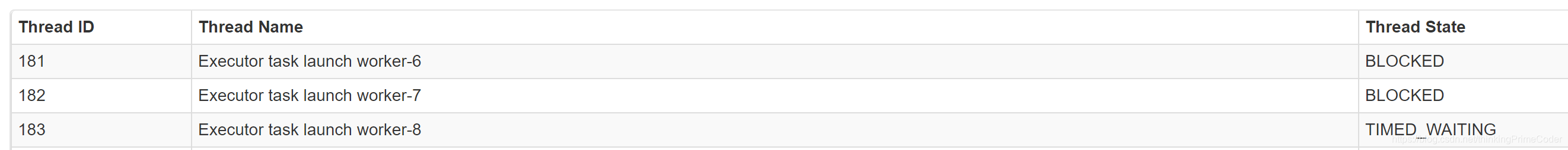 3.点击thread dump后可看到线程Executor task launch worker-6和Executor task launch worker-7处于BLOCKED状态,Executor task launch worker-8处于time_waiting状态。