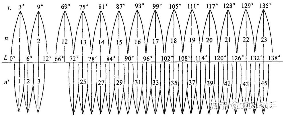 仔细观察分带投影,因为我们国家的经度范围大致在73°33′E~105°05′E,所以如果是以带号命名,带号在13~23带之间的,说明是6°分带法;带号在25~45带之间的,说明是3°分带法。