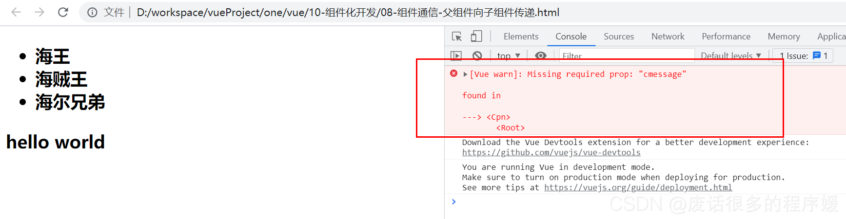 当props对象的required值为true的时候,必须要传这个值,否则会报错,报错信息见下图: