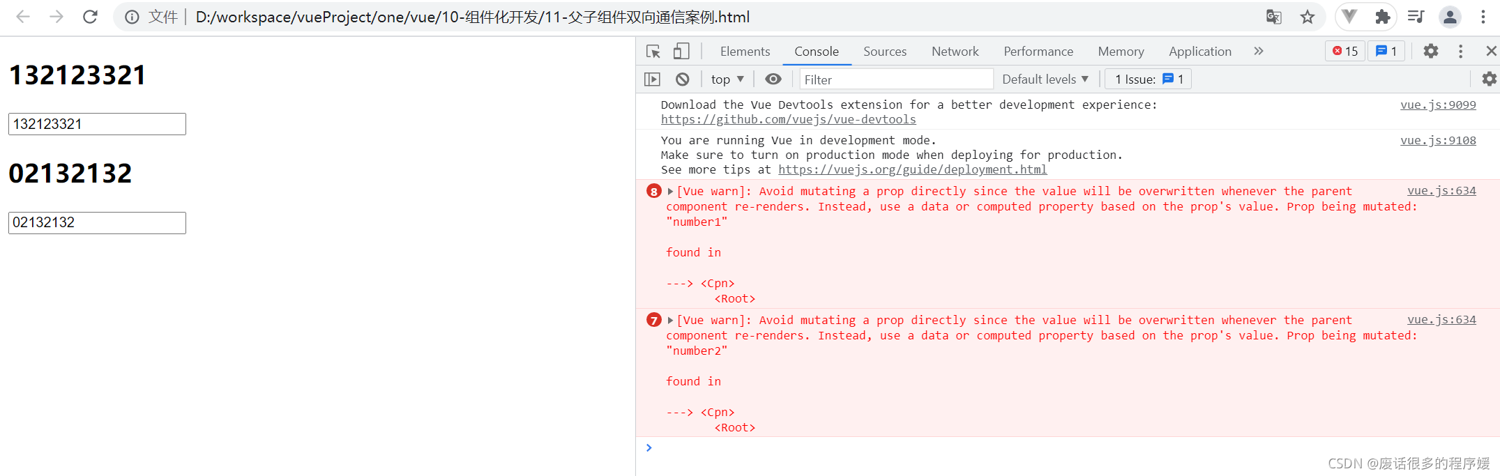 <!--不建议这么使用,会报错。避免直接改变props的值,尽量由父组件去修改这个值。-->