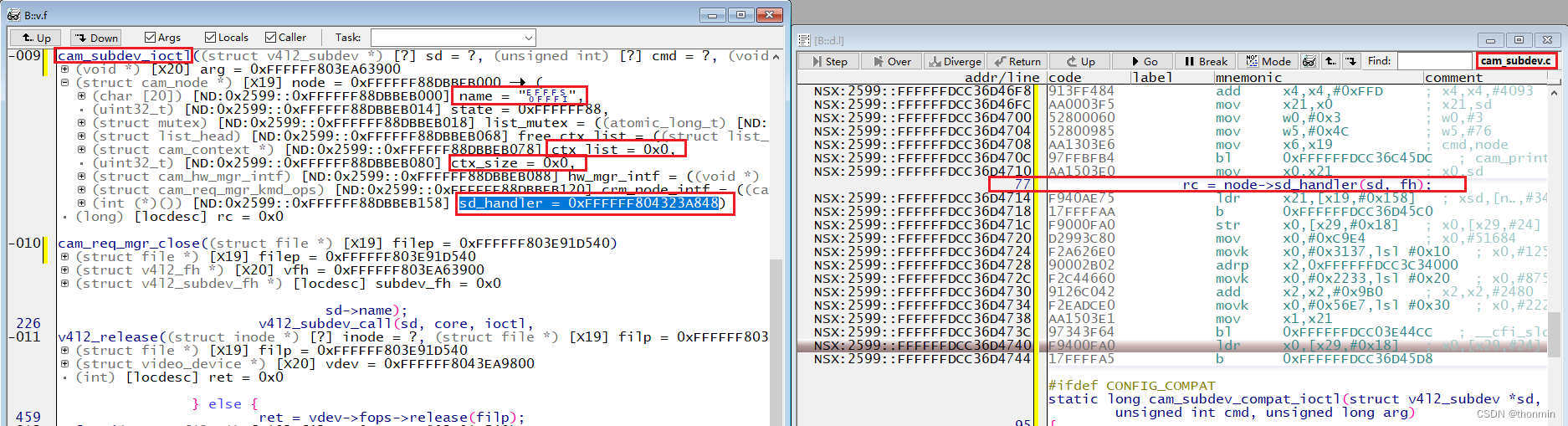 右侧图可以看到:函数出问题的位置在cam_subdev.c的 77行