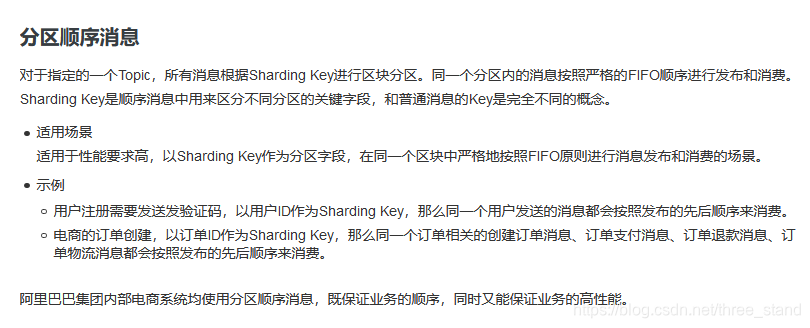 分区顺序:对于指定的一个Topic,所有消息根据Sharding Key进行区块分区。同一个分区内的消息按照严格的FIFO顺序进行发布和消费。Sharding Key是顺序消息中用来区分不同分区的关键字段,和普通消息的Key是完全不同的概念。