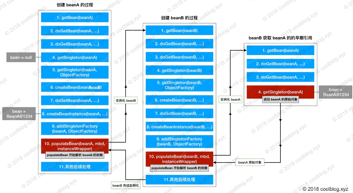 3、Spring通过将实例化后的对象提前暴露给Spring容器中的singletonFactories,解决了循环依赖的问题。