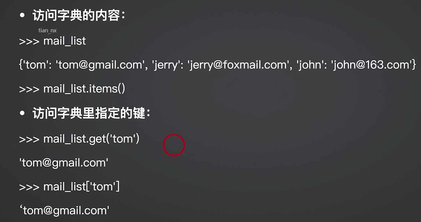 # 所有元素 dict_items([('tom', 'tom@gmail.com'), ('jerry', 'jerry@foxmail.com'), ('john', 'john@163.com')])
