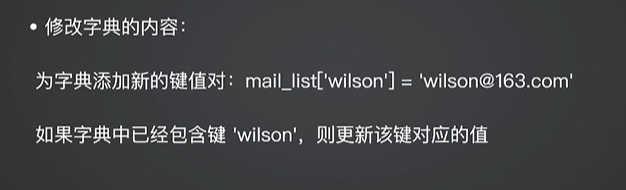 - 为字典增加或移除键值对,如果新增键已存在,则更新该键对应的值