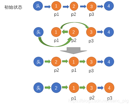 第二个思路和第一个思路的不同之处在于不改变head和p1的引用,每次都直接将p2插入到head之后,也不会出现环,实现的原理如下图: