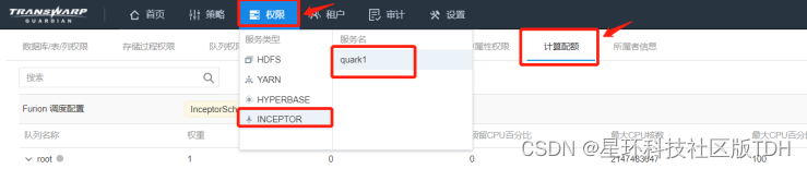 ② 在顶部菜单栏,单击权限,然后选择 INCEPTOR > Quark1;