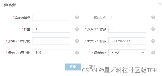 - 最大 CPU 百分比:队列可使用的 CPU 资源上限百分比,超过该上限的队列中的任务将不再被调度。