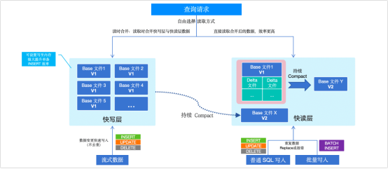 高效读取:系统后台自动执行合并操作,将写入的基础数据文件合并去重后转移至快读层。这种分层机制确保读取时无需额外的合并处理,同时结合向量化引擎加速查询,大幅提升查询效率。