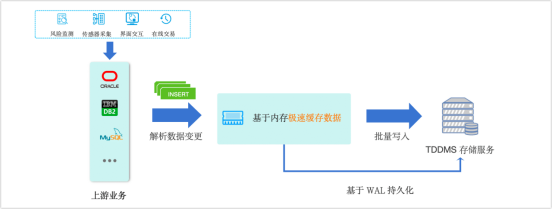 如上图所示,ArgoDB 将上游解析到 INSERT 操作写入至内存中进行缓存,并通过 WAL 日志实现数据持久化,后续以微批的形式写入到 TDDMS 存储服务中,实现数据的极速插入,优势如下: