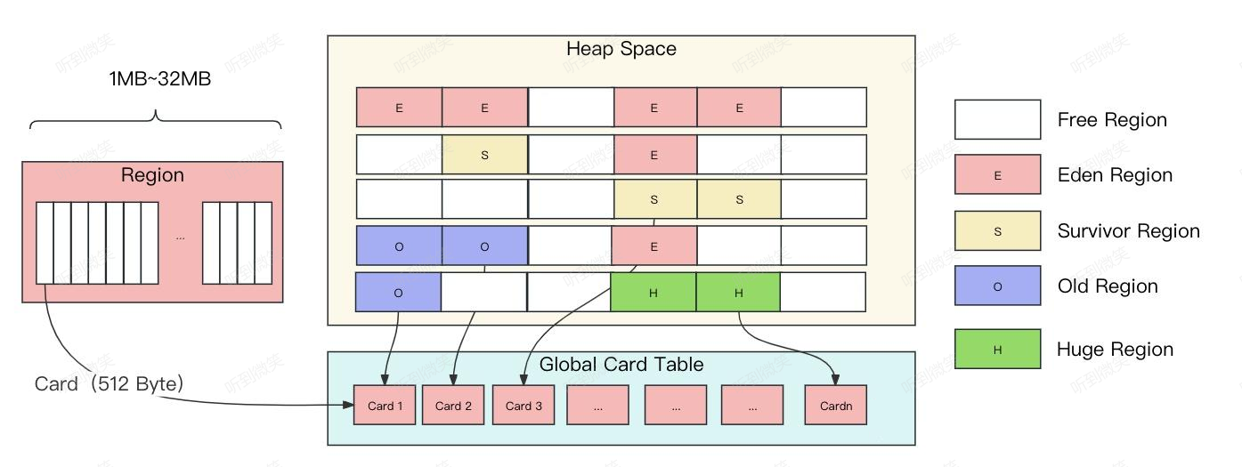 对于G1收集器而言内存区域会被划分成Eden Region、Survivor Region、Old Region和Humongous Region等不同分代的区域,而这些区域内部又会按照512 Bytes的大小为一个Card,进一步被划成为多个Card。