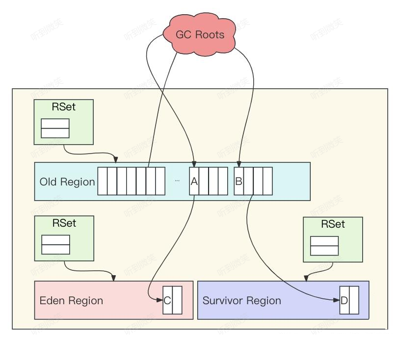 由于G1垃圾回收器的回收粒度是按照区域(Region进行的),为了记录Region之间对象引用关系,当Region初始化的时候,JVM会拿出这个Region的一部分区域用来初始化一个RSet(Remembered Set,已记忆集合),这个集合的作用是记录和跟踪其它Region指向该Region中对象的Card的引用。在进行垃圾标记的时候,除了从GC Roots开始遍历,还会从RSet开始遍历,确保该区域中所有存活的对象都会被标记到。