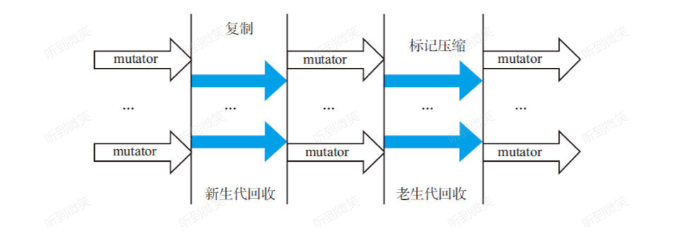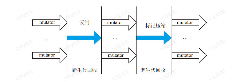 本文的图例中没有mutator运行的区间都是指STW。实际上串行回收中的老生代回收不仅仅回收老生代,还回收新生代。图中一个箭头表示一个线程,此图中执行垃圾回收过程只有一个箭头,表示只有一个后台线程执行回收任务。深色箭头表示的是垃圾回收工作线程,空心箭头表示应用程序线程。