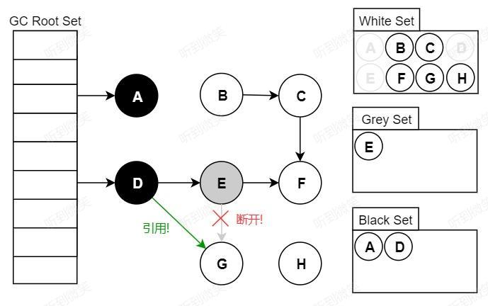 漏标问题指的是原本应该被标记为存活的对象,被遗漏标记为黑色,从而导致该垃圾对象被错误回收。 例如下图中,假设我们现在遍历到了节点 E,此时应用执行如下代码。这时候因为 E 对象没有引用了 G 对象,因此扫描 E 对象的时候并不会将 G 对象标记为黑色存活状态。但由于用户线程的 D 对象引用了 G 对象,这时候 G 对象应该是存活的,应该标记为黑色。但由于 D 对象已经被扫描过了,不会再次扫描,因此 G 对象就被漏标了。