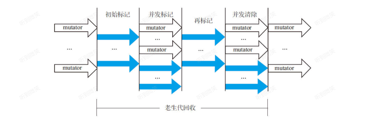 整个回收期间划分成多个阶段:初始标记、并发标记、重新标记、并发清除等。在初始标记和重新标记阶段需要暂停应用程序线程,在并发标记和并发清除期间工作线程可以和应用程序并发运行。这个算法通常适用于老生代,新生代可以采用并行复制回收,也可以采用串行复制算法。CMS垃圾回收的执行过程如图所示:
