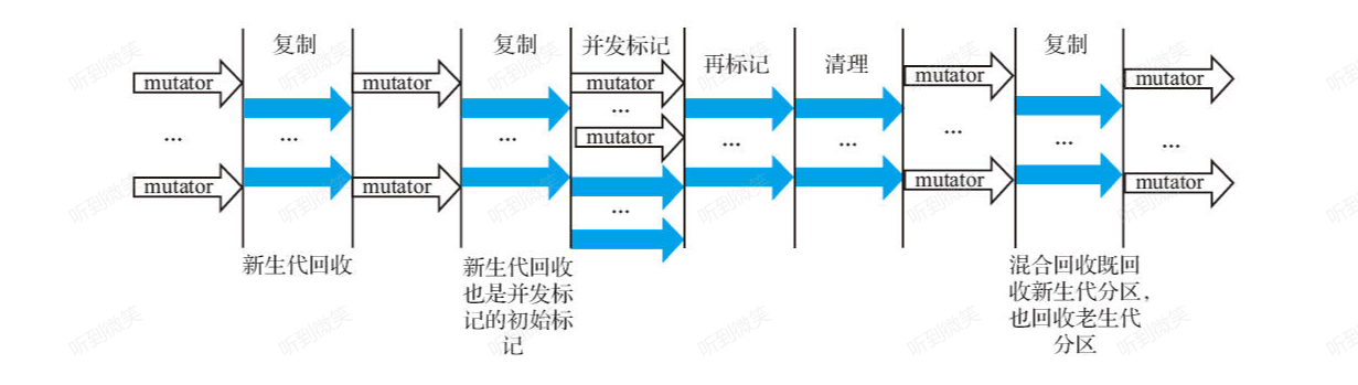 tips:并发标记阶段中还可以发生YGC(可以是一次YGC,也可以是多次YGC),但为了简化并未体现;另外,在图中混合回收也可能发生多次,因为G1对停顿时间是有要求的,G1会根据预测的停顿时间决定一次回收老生代分区的数目,所以可能需要多次混合回收,才能完成并发标记阶段识别的垃圾比较多的老生代分区的回收。