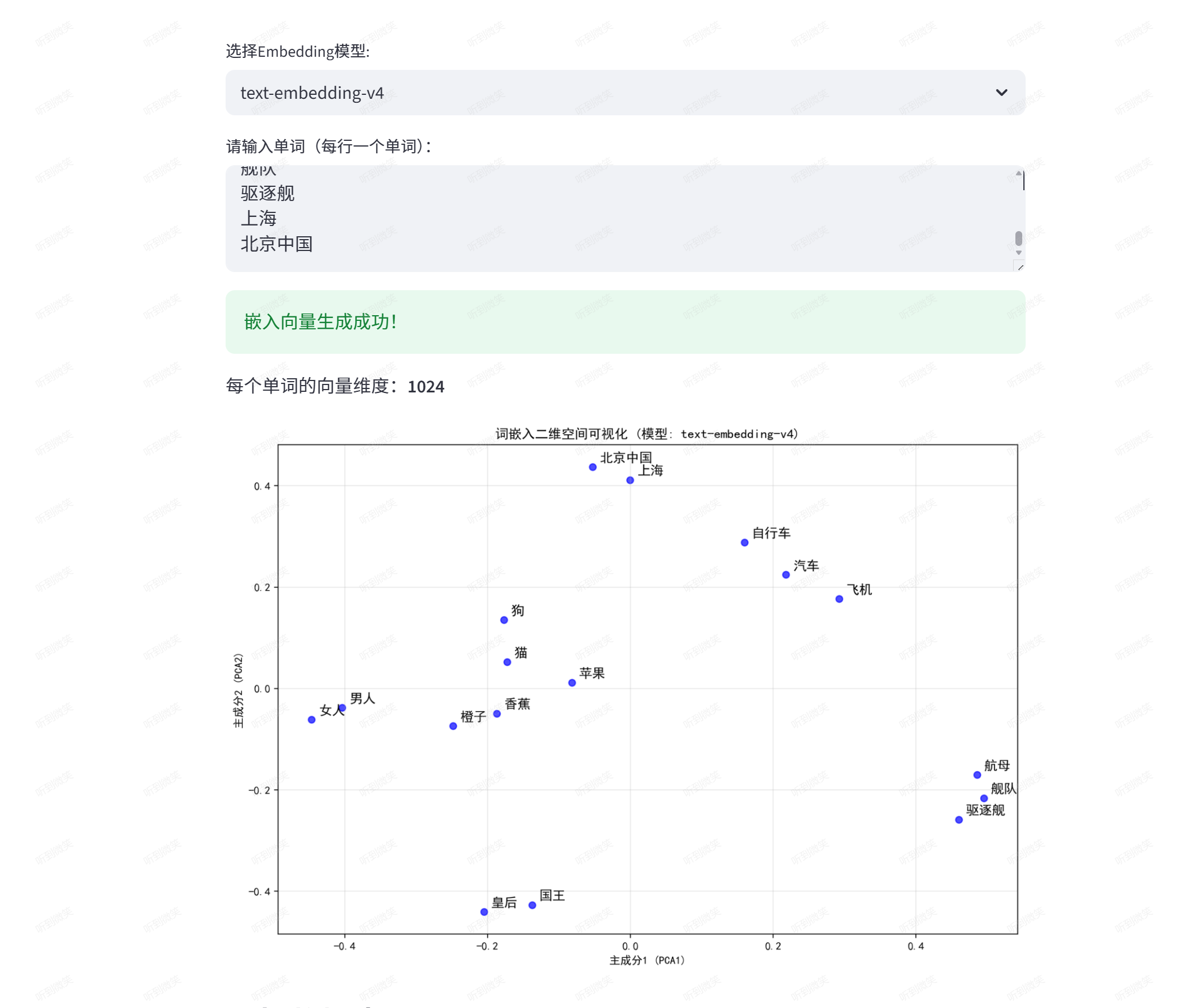 这段代码调用阿里百炼平台的 text-embedding 模型获取用户输入单词的词向量,通过 PCA 降维后使用 Matplotlib 绘制二维散点图,并借助 Streamlit 构建交互式界面展示词嵌入的空间分布及语义相似度分析。