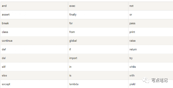 在一种语言中有一些被视为语言根基的东西是不允许我们去定义的,我们编写程序的时候要避免写python的保留字相同的变量。这些保留字有那些呐?如下图所示: