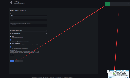 在配置好上述email信息之后,我们重启gafana,然后打开我们的报警配置Tab,如图所示: