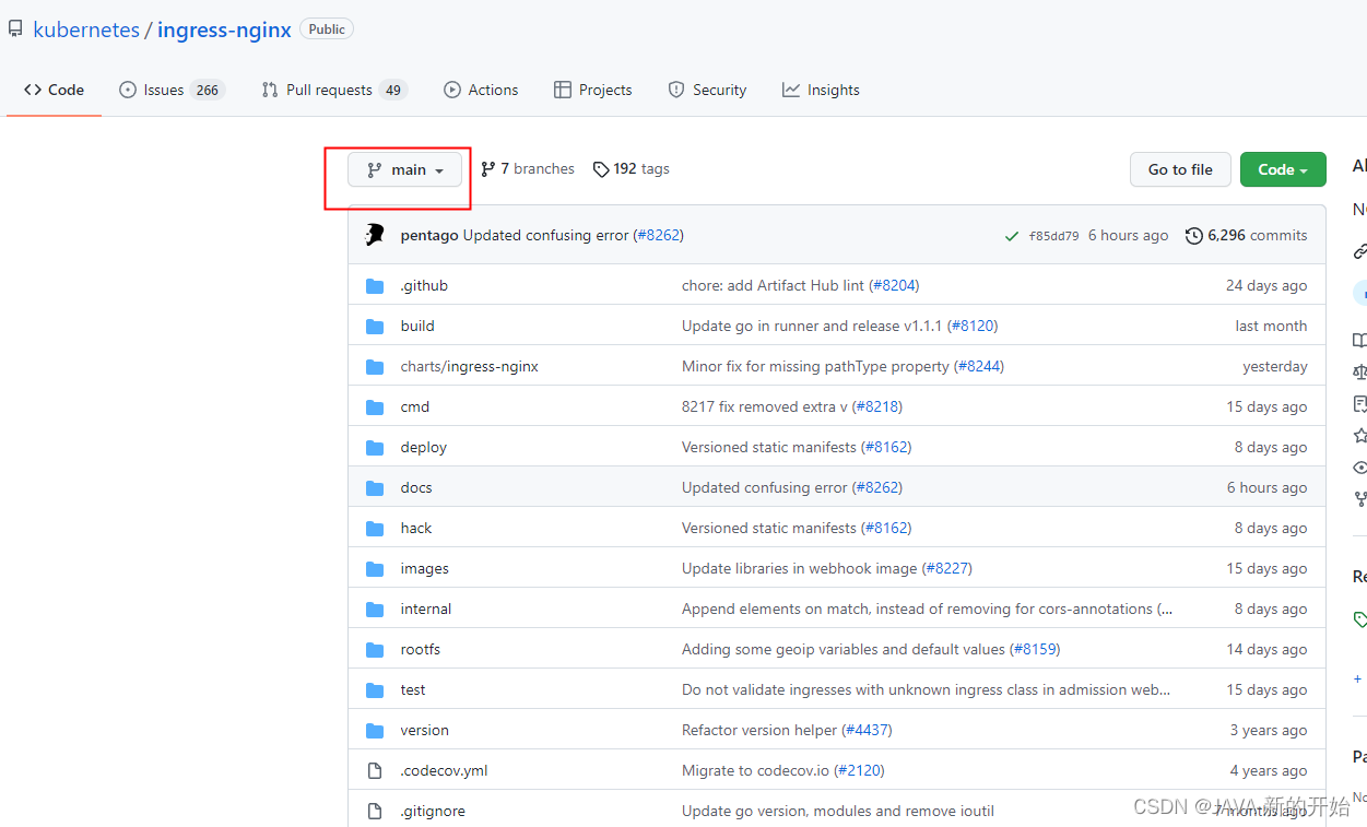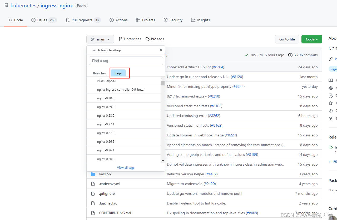 ,选择分支中的tag,会列出所有的Ingress的版本信息,搜索们需要的版本即可,我这里用的是controller-v0.47.0版本: