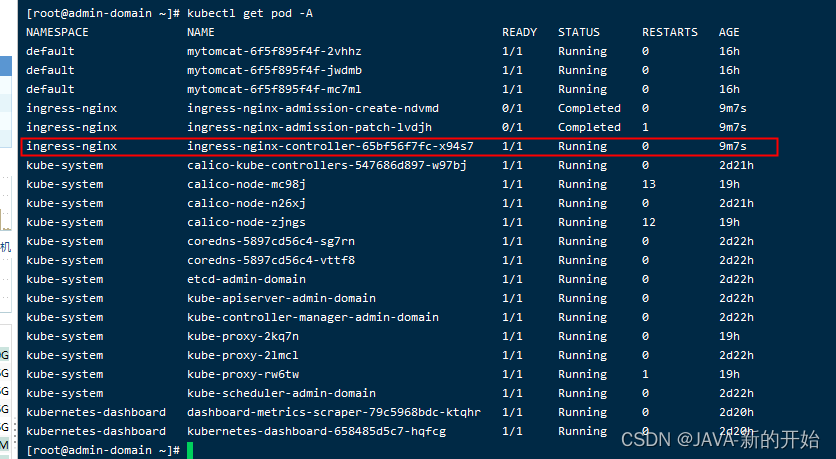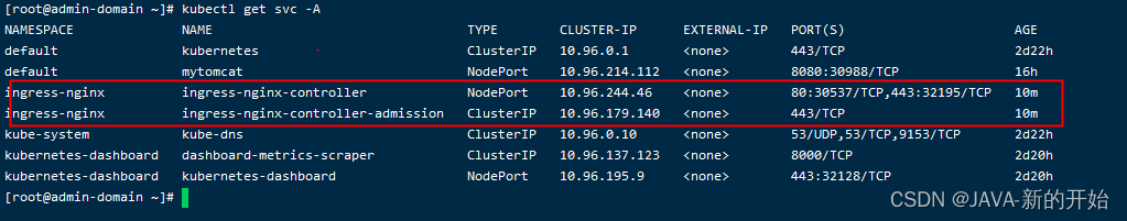当ingress-nginx-controller处于running状态时,即安装完成。ingress安装完成后会自动创建一个service服务。可以通过 kubectl get svc -A查看一下