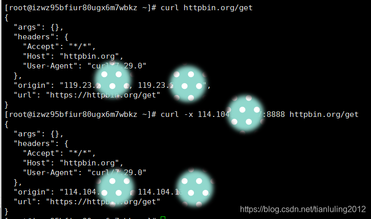 上图中访问httpbin.org/get得到本地IP为119.23.xx.x,通过代理端口访问该地址,得到的IP地址为114.104.xx.x,这说明代理搭建成功。