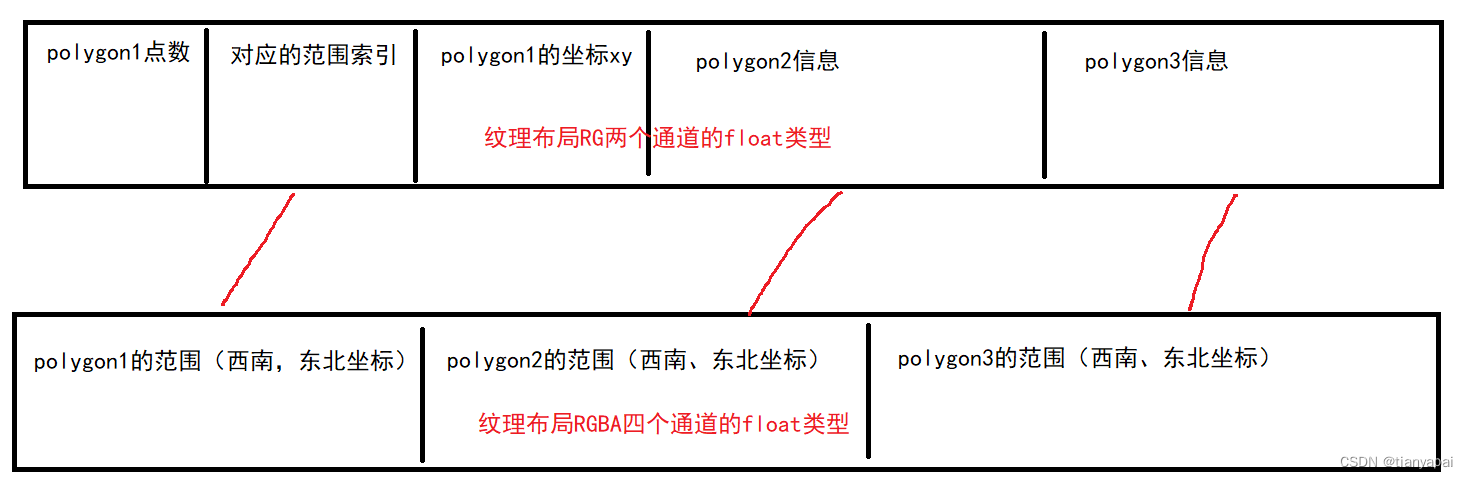 - 将多个边界打包成两张纹理,一张是每个多边形的坐标,另一张是每个多边形的边界;
