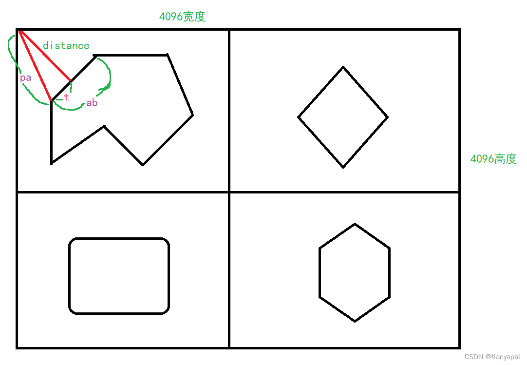 - 遍历这个索引下的多边形中的相邻的两个顶点坐标并计算向量,然后再计算像素坐标对应的边界插值坐标,将插值坐标投影到计算向量上,然后计算垂向量,垂向量的长度就是距离场;