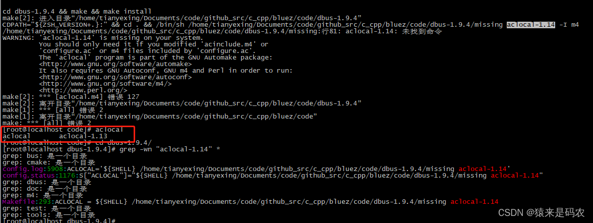 没有找到 aclocal-1.14, 但是有 aclocal-1.13 版本的,那最直接的方法就是修改 Makefile了,搜索出来 Makefile 指定了 aclocal-1.14,修改成 aclocal-1.13 即可。修改完还会有如下的错误: