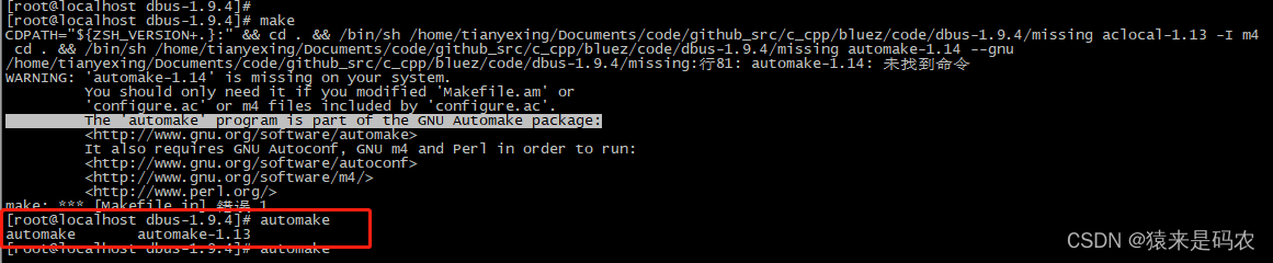 在编译bluez软件包时遇到错误,由于系统中只有aclocal-1.13而非指定的aclocal-1.14,导致编译失败。通过修改Makefile,将aclocal-1.14替换为aclocal-1.13后,又发现类似问题存在于automake-1.14。同样地,修改Makefile以适应automake-1.13,解决了编译中的依赖问题。