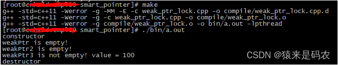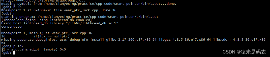 在使用 lock() 函数时,可以判断其是否为nullptr。当用 gdb 查看时可以看到:lck=weakPtr.lock()后,lck 就是 0。