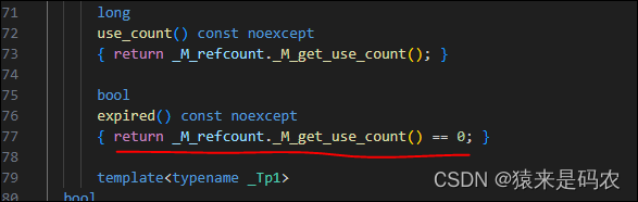 bool expired() const noexcept; 函数返回 weak_ptr 对象是否是空的,或是它所属的所有者组中不再有shared_ptr。此函数与 use_count() == 0 意义相同。