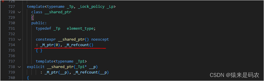 _M_ptr 是模板参数类型的指针,它指向的就是要管理的对象。而 _M_refcount 是管理引用计数的。所以一个空的 shared_ptr<> 并不管理任何对象,就不能当作对象指针来用了。但 use_count() 还是可以用的,用 lck.use_count() == 0 进行判断: