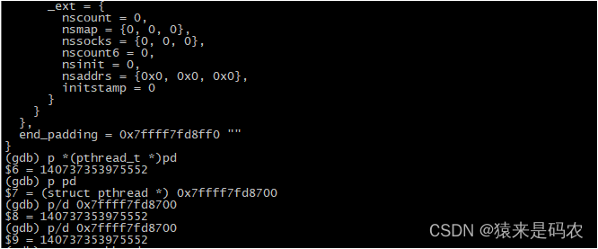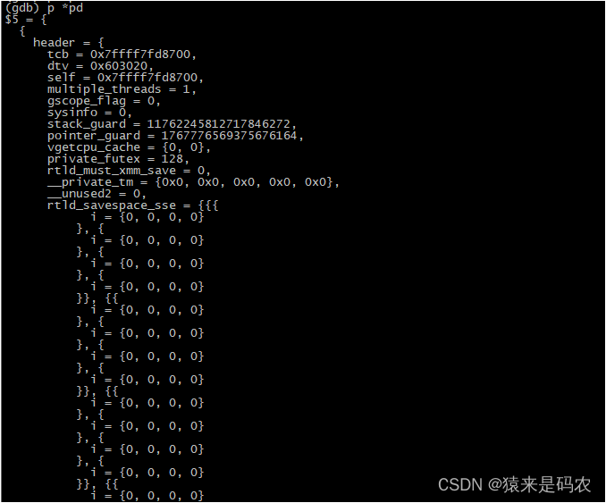 这个 pd 指针的值就是 0x7ffff7fd8700,而这个值也是结构体里数据的首地址: