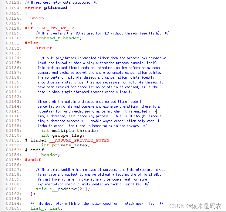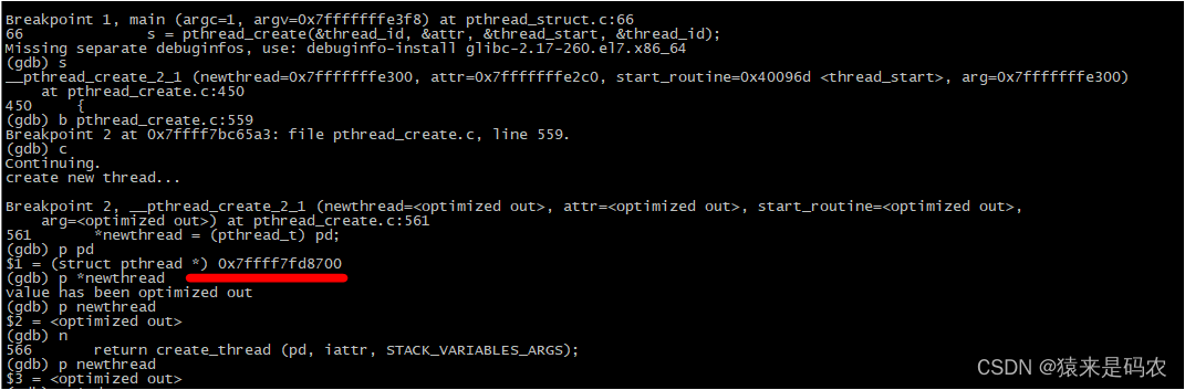 就是执行程序里打印的线程 id。 所以 pthread_create() 返回的线程 id,其实就是保存线程信息的结构体的首地址。因此这个线程 id 是很重要的,其他线程相关函数可以通过这个 id 访问线程信息,如 pthread_t 强转为 struct pthread* 类型,其实 thread_id 就是一个地址: