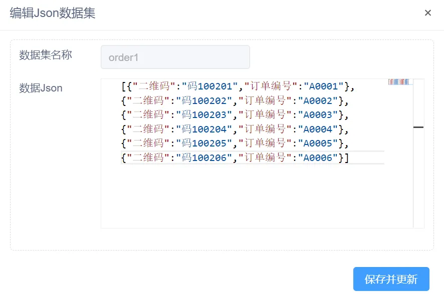 [{"二维码":"码100201","订单编号":"A0001"},{"二维码":"码100202","订单编号":"A0002"},{"二维码":"码100203","订单编号":"A0003"},{"二维码":"码100204","订单编号":"A0004"},{"二维码":"码100205","订单编号":"A0005"},{"二维码":"码100206","订单编号":"A0006"}]