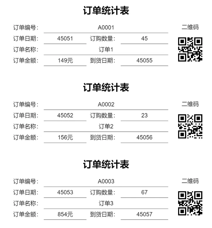 [{"订单编号":"A0001","订单日期":45051,"订购数量":45,"订单名称":"订单1","订单金额":149,"到货日期":45055,"订单统计表":"订单统计表"},{"订单编号":"A0002","订单日期":45052,"订购数量":23,"订单名称":"订单2","订单金额":156,"到货日期":45056,"订单统计表":"订单统计表"},{"订单编号":"A0003","订单日期":45053,"订购数量":67,"订单名称":"订单3","订单金额":854,"到货日期":45057,"订单统计表":"订单统计表"},{"订单编号":"A0004","订单日期":45054,"订购数量":15,"订单名称":"订单4","订单金额":157,"到货日期":45058,"订单统计表":"订单统计表"},{"订单编号":"A0005","订单日期":45055,"订购数量":67,"订单名称":"订单5","订单金额":642,"到货日期":45059,"订单统计表":"订单统计表"},{"订单编号":"A0006","订单日期":45056,"订购数量":89,"订单名称":"订单6","订单金额":945,"到货日期":45060,"订单统计表":"订单统计表"}]