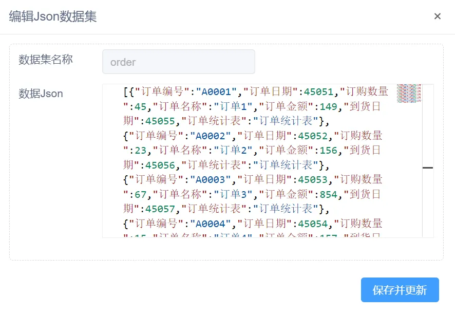 在数据面板中添加数据集,可选择Json数据集和Http接口数据集,order1的Json数据如下图所示: