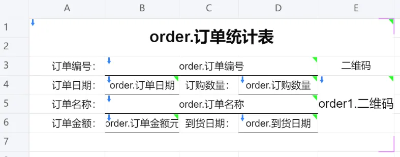 将order数据集中的数据字段拖入到A1、B3、B4、B6、D3、D6单元格,order1数据集中的数据字段拖入到E4单元格,并将单元格设置为向下扩展,将B3、B4、B5、D6表格设置成分组,D4、B6设置成汇总,按图中颜色添加分组,如下图所示: