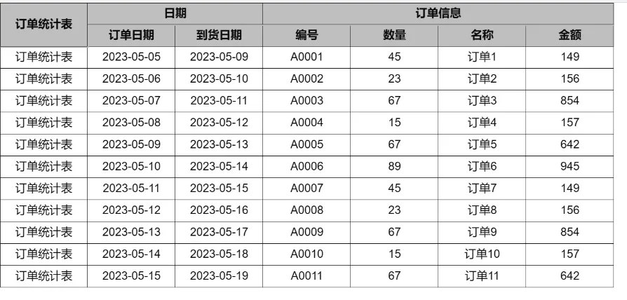 [{"到货日期":"2023-05-09","订单名称":"订单1","订单日期":"2023-05-05","订单编号":"A0001","订单金额":149,"订购数量":45,"订单统计表":"订单统计表"},{"到货日期":"2023-05-10","订单名称":"订单2","订单日期":"2023-05-06","订单编号":"A0002","订单金额":156,"订购数量":23,"订单统计表":"订单统计表"},{"到货日期":"2023-05-11","订单名称":"订单3","订单日期":"2023-05-07","订单编号":"A0003","订单金额":854,"订购数量":67,"订单统计表":"订单统计表"},{"到货日期":"2023-05-12","订单名称":"订单4","订单日期":"2023-05-08","订单编号":"A0004","订单金额":157,"订购数量":15,"订单统计表":"订单统计表"},{"到货日期":"2023-05-13","订单名称":"订单5","订单日期":"2023-05-09","订单编号":"A0005","订单金额":642,"订购数量":67,"订单统计表":"订单统计表"},{"到货日期":"2023-05-14","订单名称":"订单6","订单日期":"2023-05-10","订单编号":"A0006","订单金额":945,"订购数量":89,"订单统计表":"订单统计表"},{"到货日期":"2023-05-15","订单名称":"订单7","订单日期":"2023-05-11","订单编号":"A0007","订单金额":149,"订购数量":45,"订单统计表":"订单统计表"},{"到货日期":"2023-05-16","订单名称":"订单8","订单日期":"2023-05-12","订单编号":"A0008","订单金额":156,"订购数量":23,"订单统计表":"订单统计表"},{"到货日期":"2023-05-17","订单名称":"订单9","订单日期":"2023-05-13","订单编号":"A0009","订单金额":854,"订购数量":67,"订单统计表":"订单统计表"},{"到货日期":"2023-05-18","订单名称":"订单10","订单日期":"2023-05-14","订单编号":"A0010","订单金额":157,"订购数量":15,"订单统计表":"订单统计表"},{"到货日期":"2023-05-19","订单名称":"订单11","订单日期":"2023-05-15","订单编号":"A0011","订单金额":642,"订购数量":67,"订单统计表":"订单统计表"}]