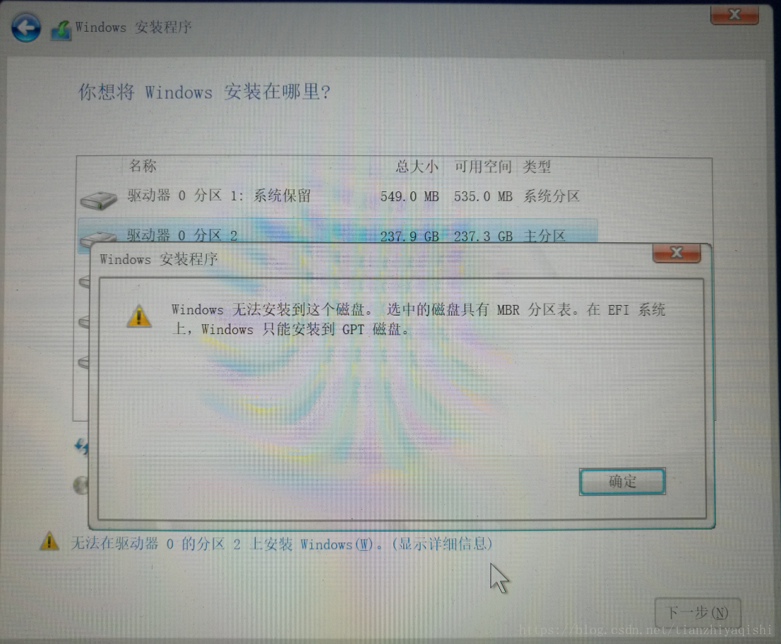 遇到的“windows 无法安装到这个磁盘.选中的磁盘采用GPT分区形式”解决办法
