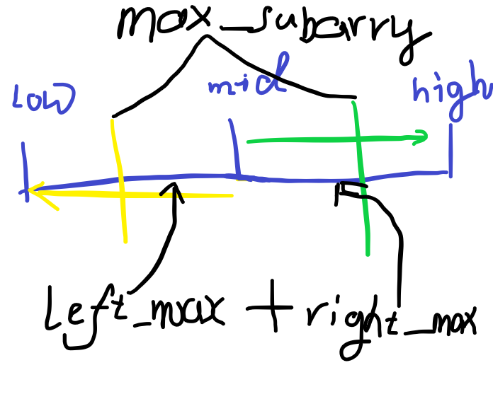 可以先从中点出发,找到左半边的最大子数组(含中点),再从中点的下一位出发,找到右半边的最大子数组(当然可以从中点出发,但中点在计算最半边的时候已经被包含了,所以没有必要重复计算) 。然后把左界和右界合并,就得到了跨越中点的最大子数组。