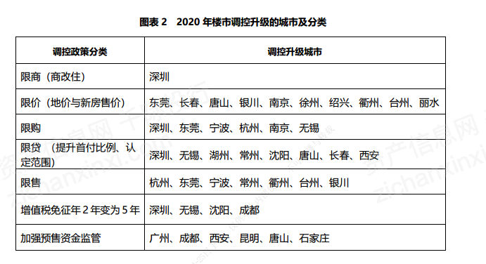部分城市房价过快上涨,调控分化趋势加剧。全年中央对于房地产“房住不炒”、“三稳”目标贯彻不变,但各地针对楼市的调控政策则呈现差异化和精准化。2020年上半年因受到疫情冲击,故“六保”和“六稳”为首要目标,多个城市从房地产供给端和需求端出台了诸多政策予以扶持,楼市调控政策总体呈现宽松态势。