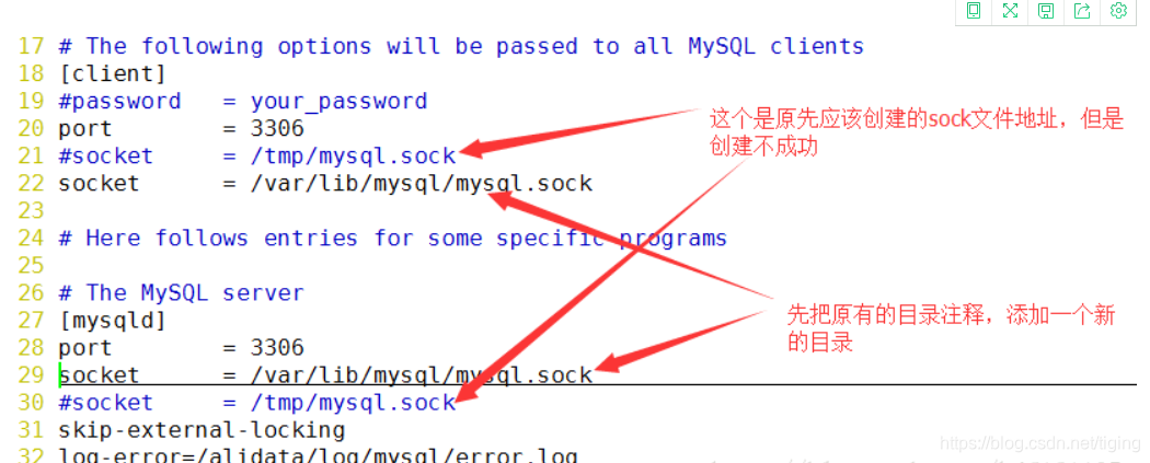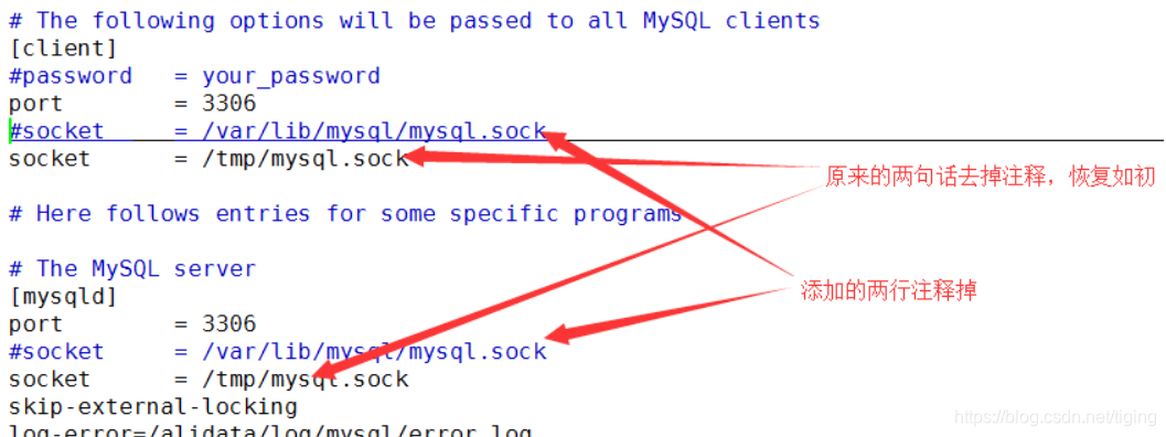 这么一运行,发现好像可以了,那接下来好办了,我们把之前改的配置改回来就行了,之前的目录应该是/tmp/mysql.sock,我们可以建立一个软连接连上去就可以了,